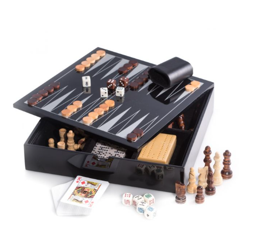 Perfect for any man-cave, game room or office! This black lacquered wood multi game set includes chess and backgammon with wooded game pieces and dice cup, dominos, cribbage, poker dice and playing cards.